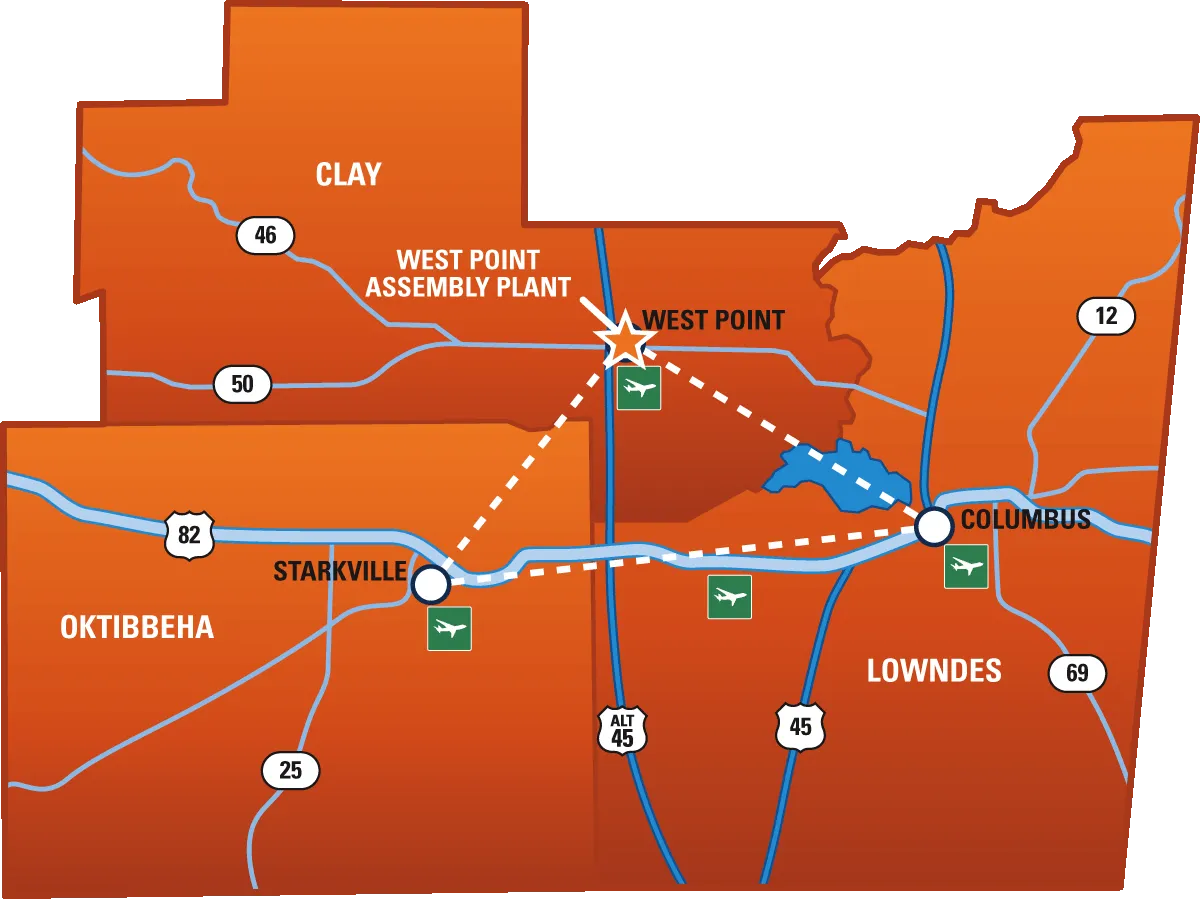 From Columbus, Starkville and West Point, local highways connect to I-20, I-22 Corridor and I-55.